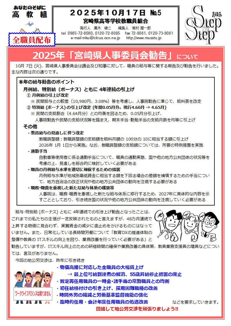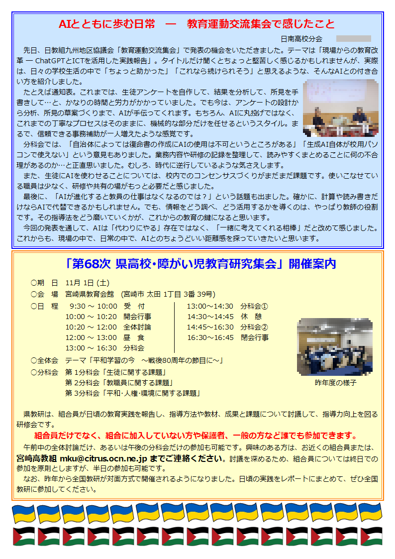 2025年「宮崎県人事委員会勧告」、九協「教育運動交流集会」の参加報告、ならびに高教組「第68次 県高校・障がい児教育研究集会」開催案内です。